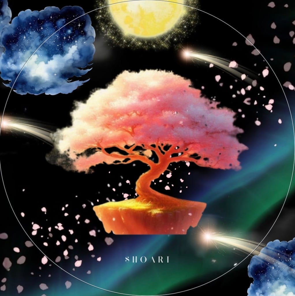 夜空に浮かぶ満月と流れ星、そして幻想的なオーロラのもとで大輪の花咲く桜。